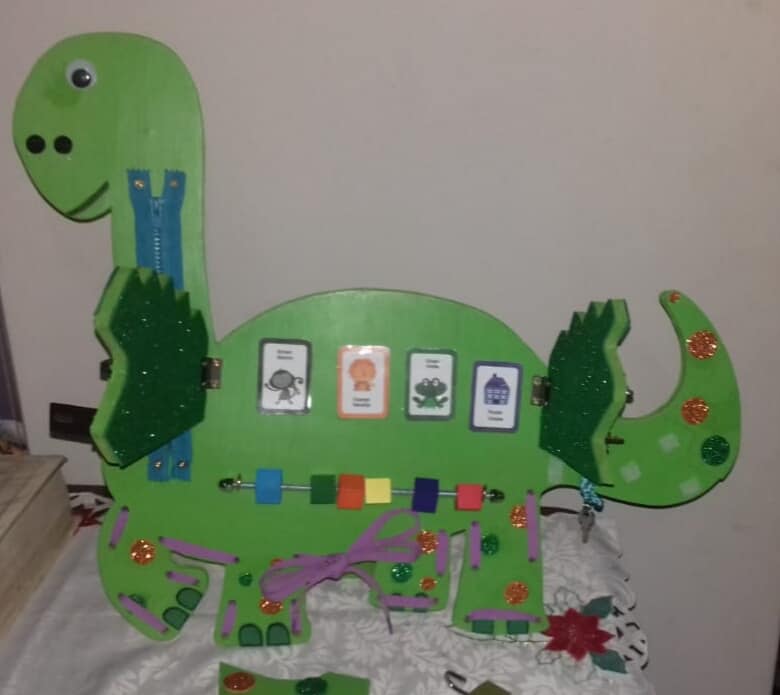 dinosaurio sensorial , su cola es un rompecabezas, cuenta con cerrojos , laminas interactivas intercambiable , ideal para todos los chicos amantes de los dinosaurios.